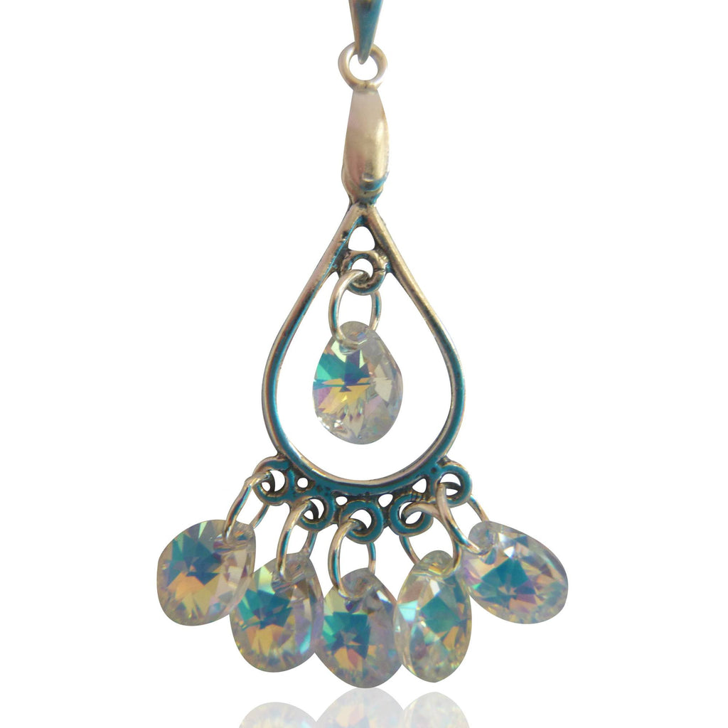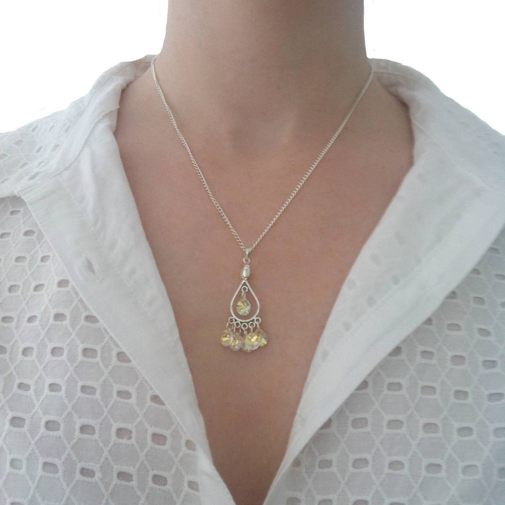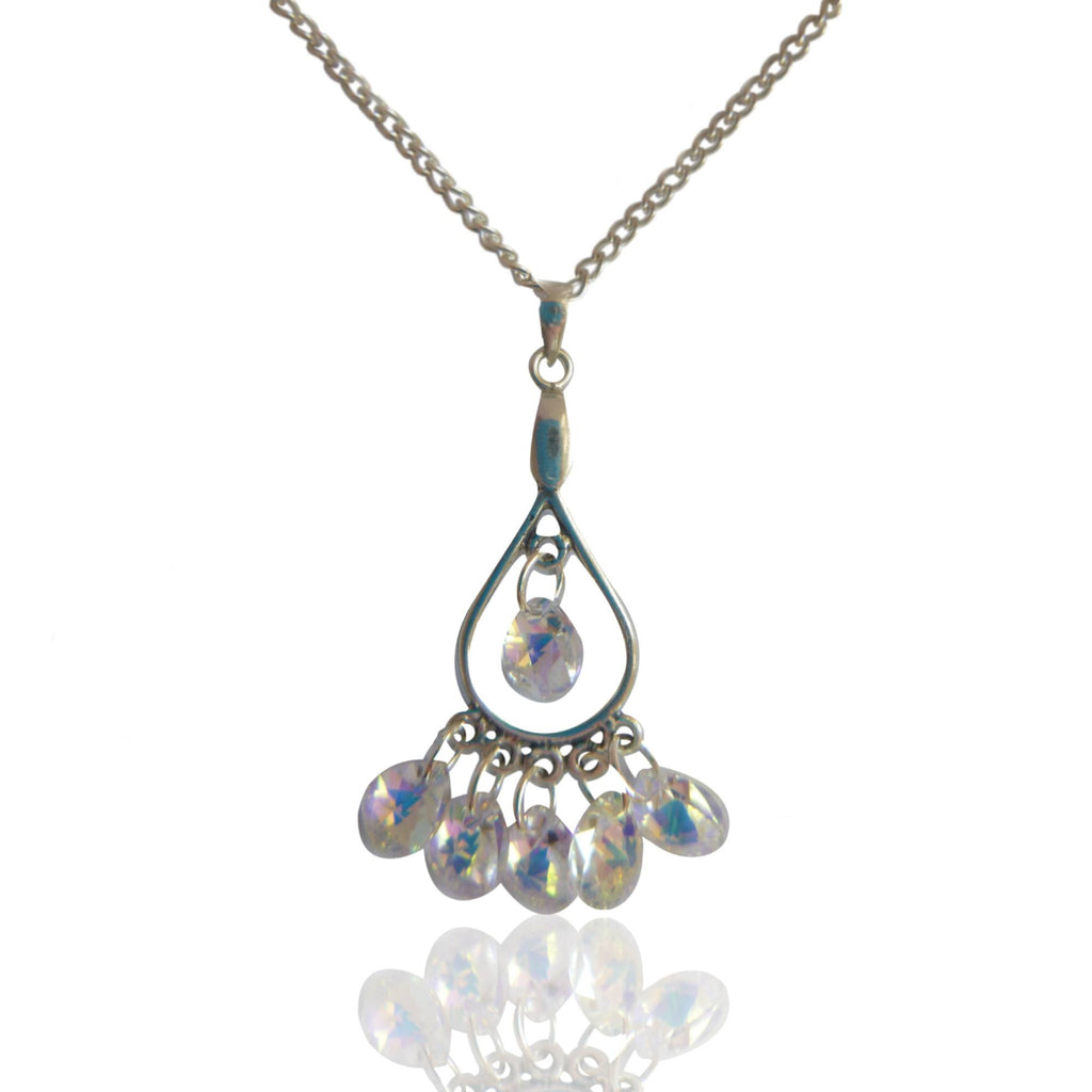 Be the centre of attention with this dazzling necklace. This made to order necklace has been lovingly handmade, and is created using 8mm, silver Swarovski pear pendants, hung from a sterling silver chandelier component, which is attached with a sterling silver clamp, to a 18" sterling silver, medium curb chain.