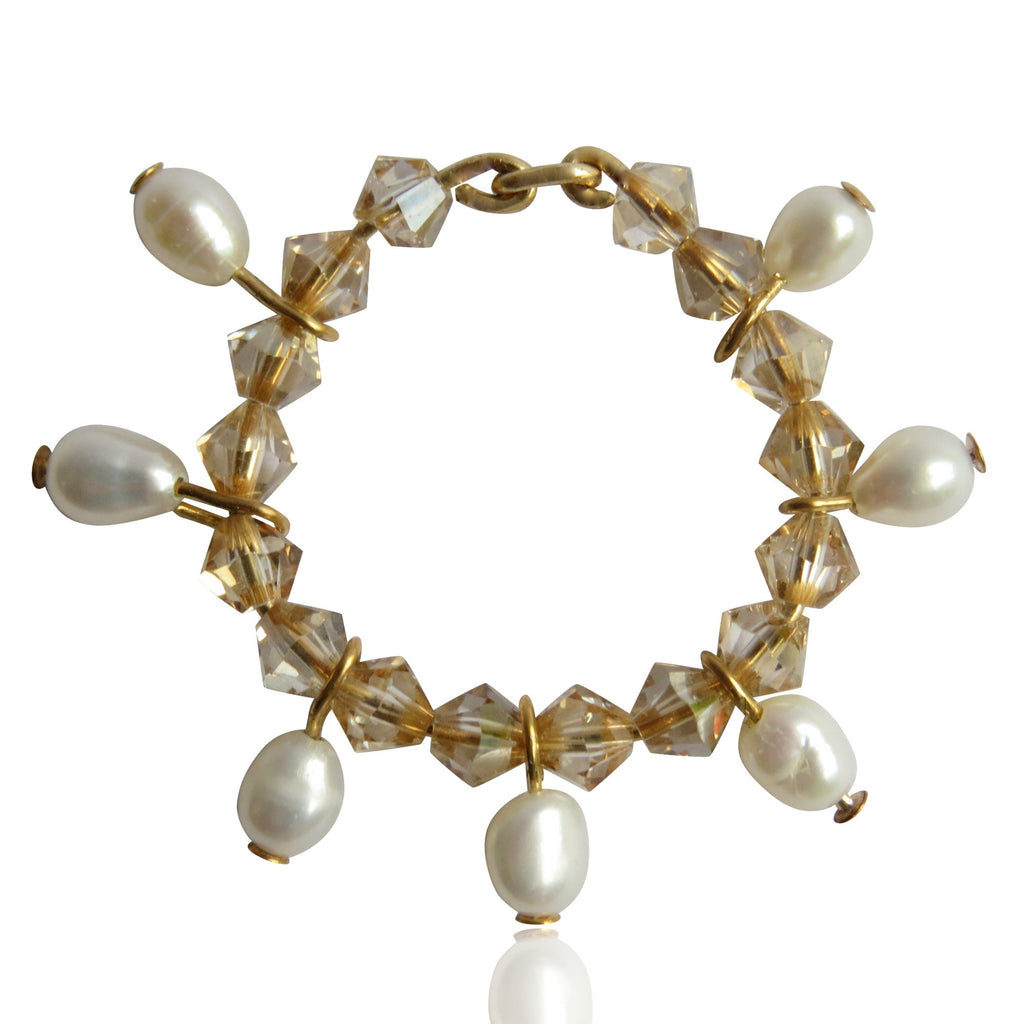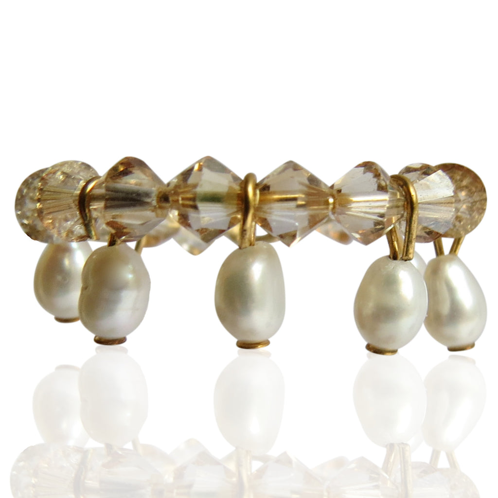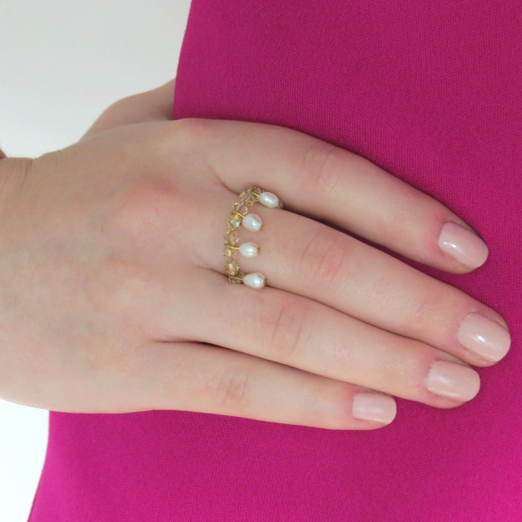 This made to order ring has been lovingly handmade, and is created using 4mm, gold Swarovski crystal beads, wrapped on 14k gold filled wire, with 4mm, freshwater pearls dangling gracefully between the crystals.