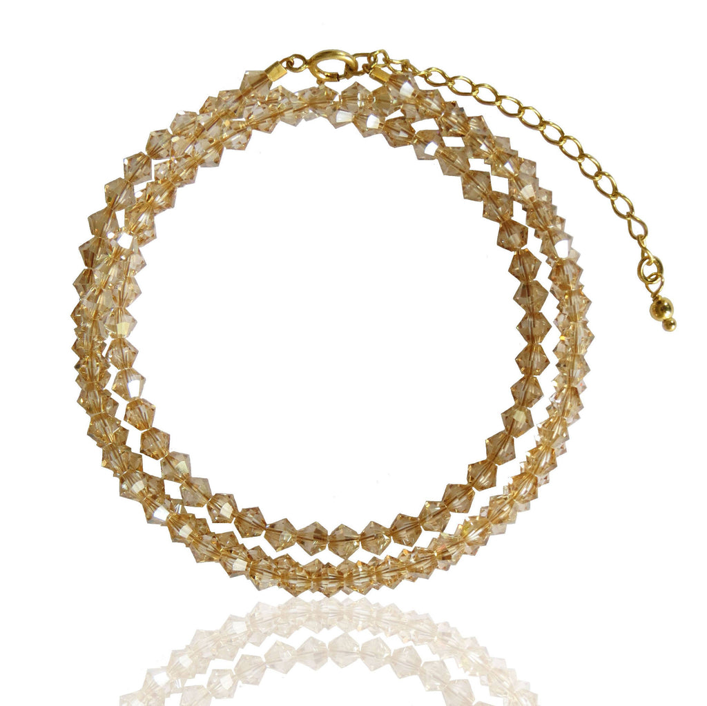 This made to order bracelet has been lovingly handmade, and is created using using 4mm gold Swarovski crystal beads, which are threaded onto a 510mm wire, which is fastened with a 18k gold vermeil clasp. This bracelet worn as a necklace would be 20" long. It also comes with a 50mm 18k gold vermeil extension chain.