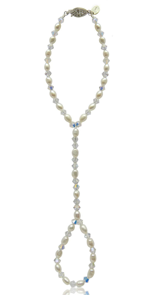 • This made to order handlet has been lovingly handmade, and is created using using 4mm, silver Swarovski crystal beads, and freshwater pearls, which are threaded onto wire, that is fastened with a sterling silver 15mm, filigree fishhook clasp. This piece of jewellery features an extended section to the bracelet region, that loops around your middle finger. The bracelet section measures 7" at length, the ring section has a circumference of 90mm, and the joining section measures 2".