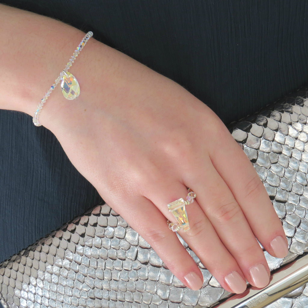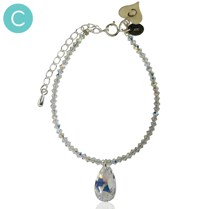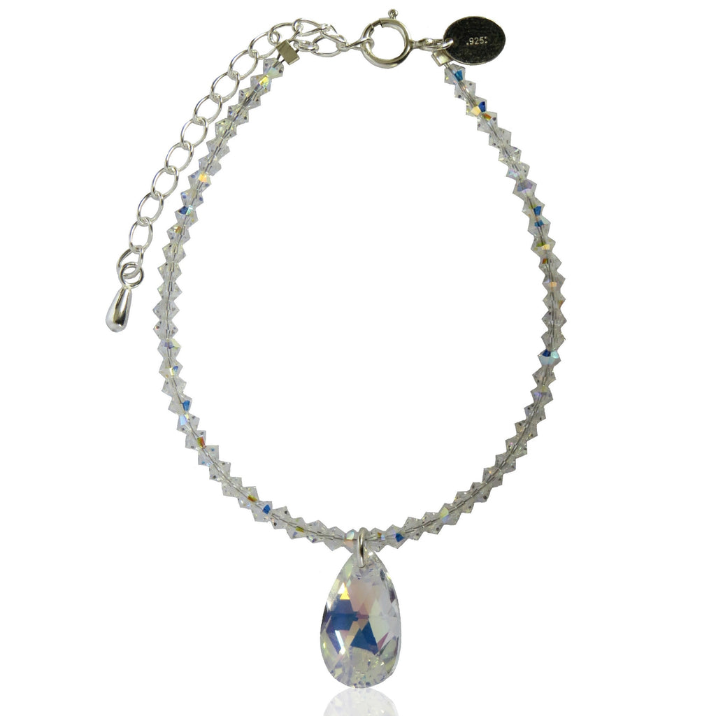 Mix and match this bracelet with the 'Mary and Joseph' or 'Ava Ring', for a really stunning combo. This made to order bracelet has been lovingly handmade, and is created using using 2.5mm silver Swarovski crystal beads, which are threaded onto wire, that is fastened with a sterling silver clasp. A 16mm, silver Swarovski pear pendant hangs down from the centre. The bracelet measures 6.75" at length, it also has a 50mm sterling silver extension chain.