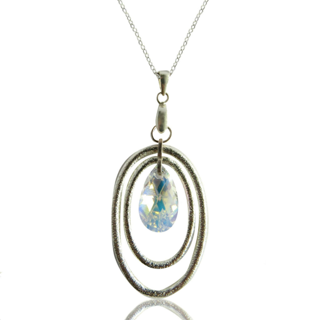 Make heads turn with this exquisite necklace. This made to order necklace has been lovingly created using a 28mm and a 37mm, silver plated, textured oval rings. These are attached, with a silver, 16mm, Swarovski, pear shaped pendant, to a sterling silver clamp, and a 24" sterling silver, medium curb chain.
