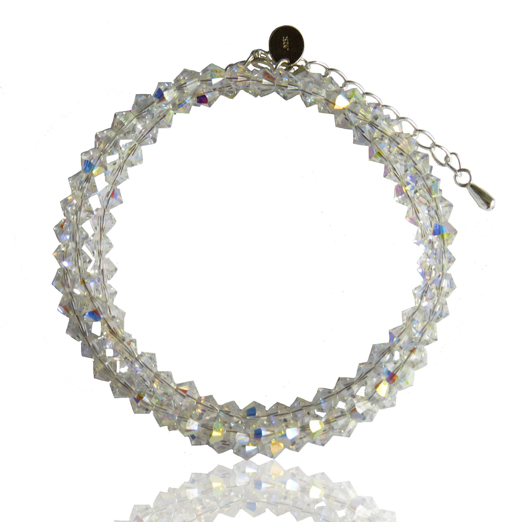 This made to order bracelet has been lovingly handmade, and is created using using 4mm silver Swarovski crystal beads, which are threaded onto a 510mm wire, which is fastened with a sterling silver clasp. This bracelet worn as a necklace would be 20" long. It also has a 50mm sterling silver extension chain.