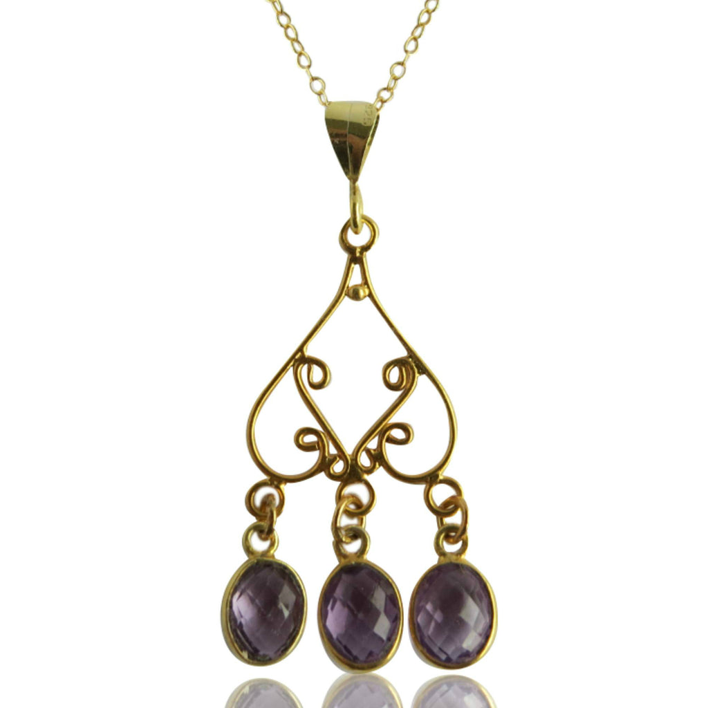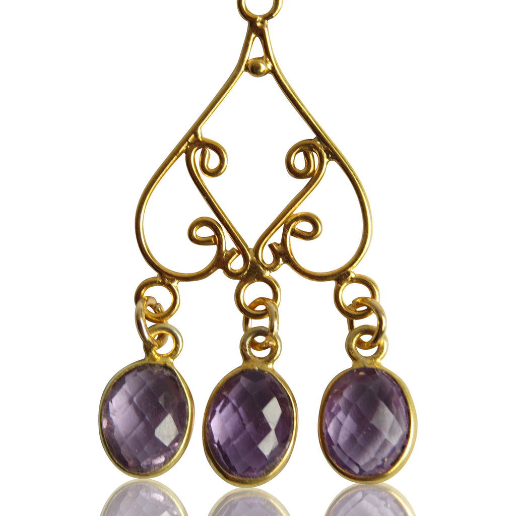 This made to order necklace has been lovingly created using 12mm, faceted, Amethyst, oval pendants, hung from a gold vermeil chandelier component, which is attached with a gold vermeil clamp, to a 16" gold vermeil chain.