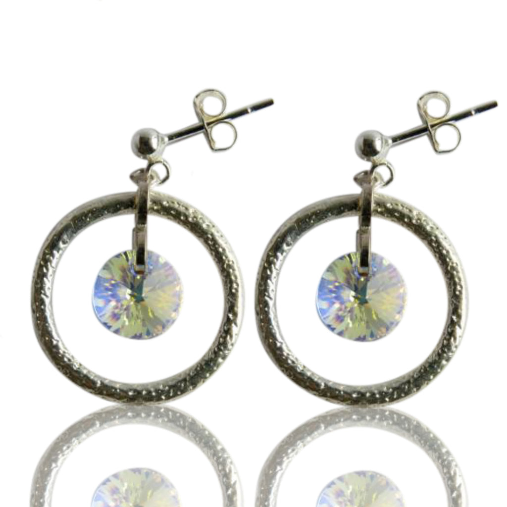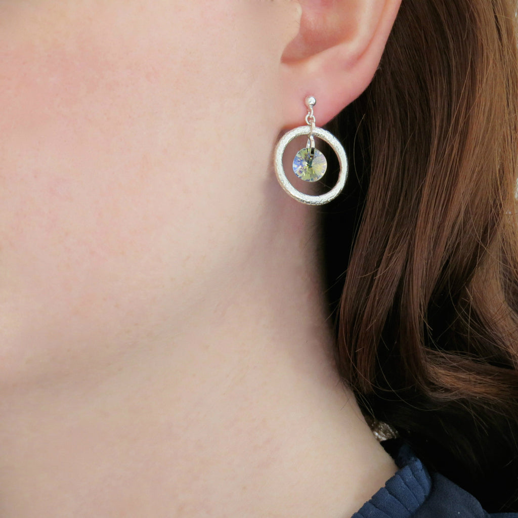 Add a splash of glamour with these bewitching earrings. Match them with the charming 'Maureen Neckless', and stand out from the crowd. These made to order earrings have been lovingly created using a 19mm, silver plated, textured ring, and a 8mm, silver, Swarovski, circular pendant. These are attached to sterling silver stud earrings.