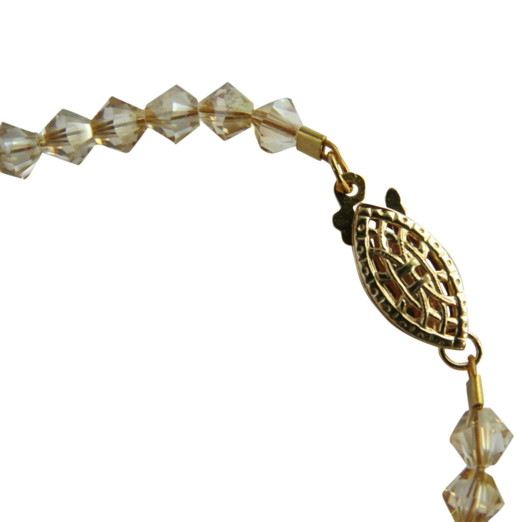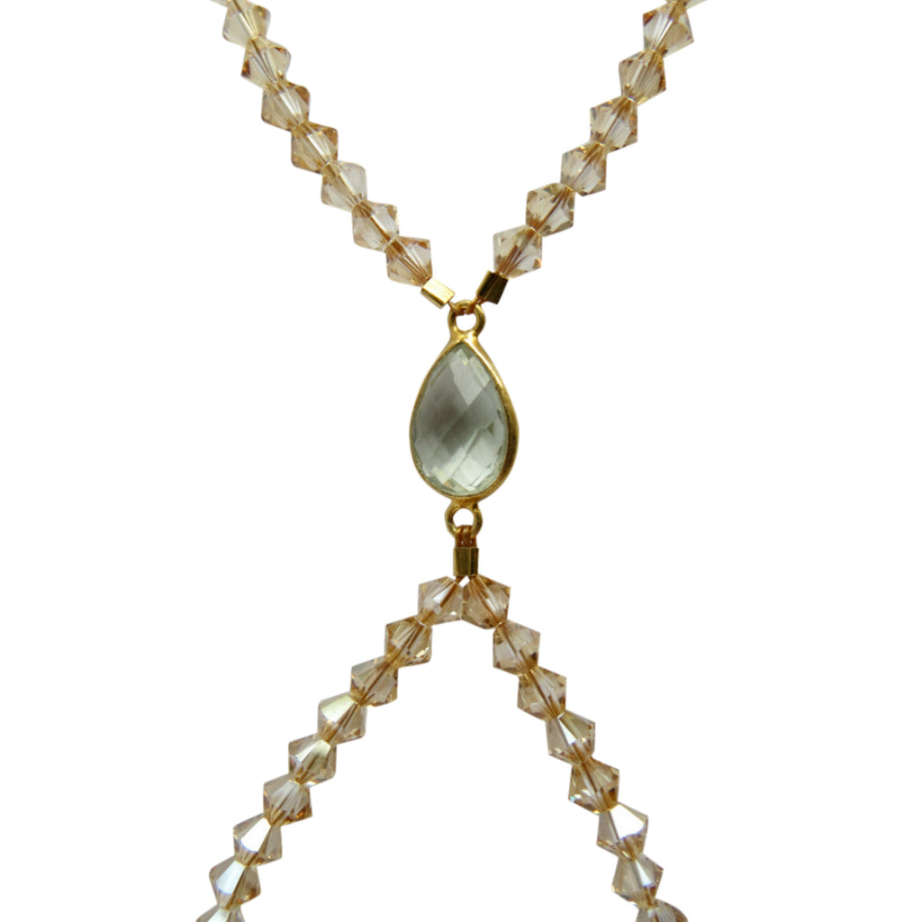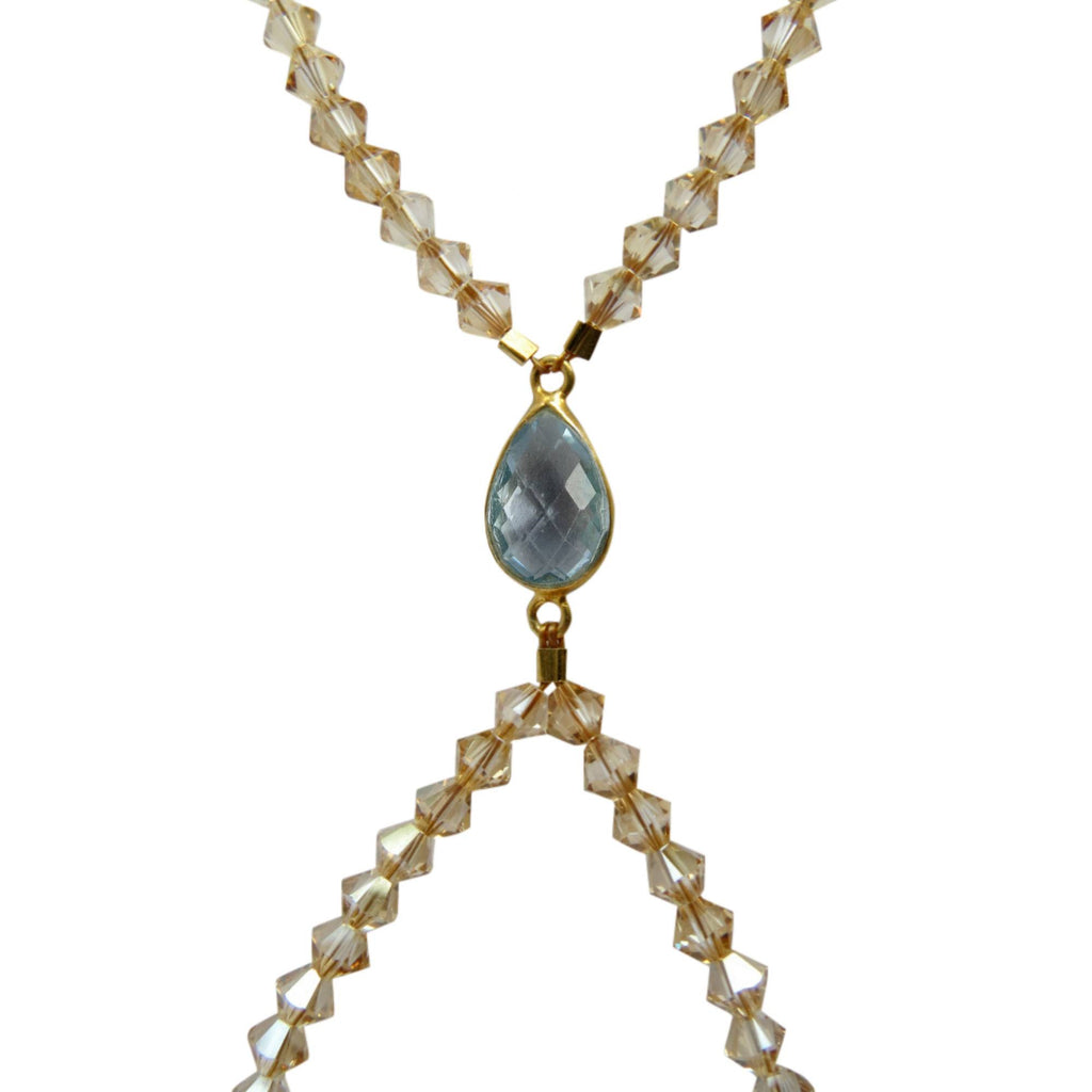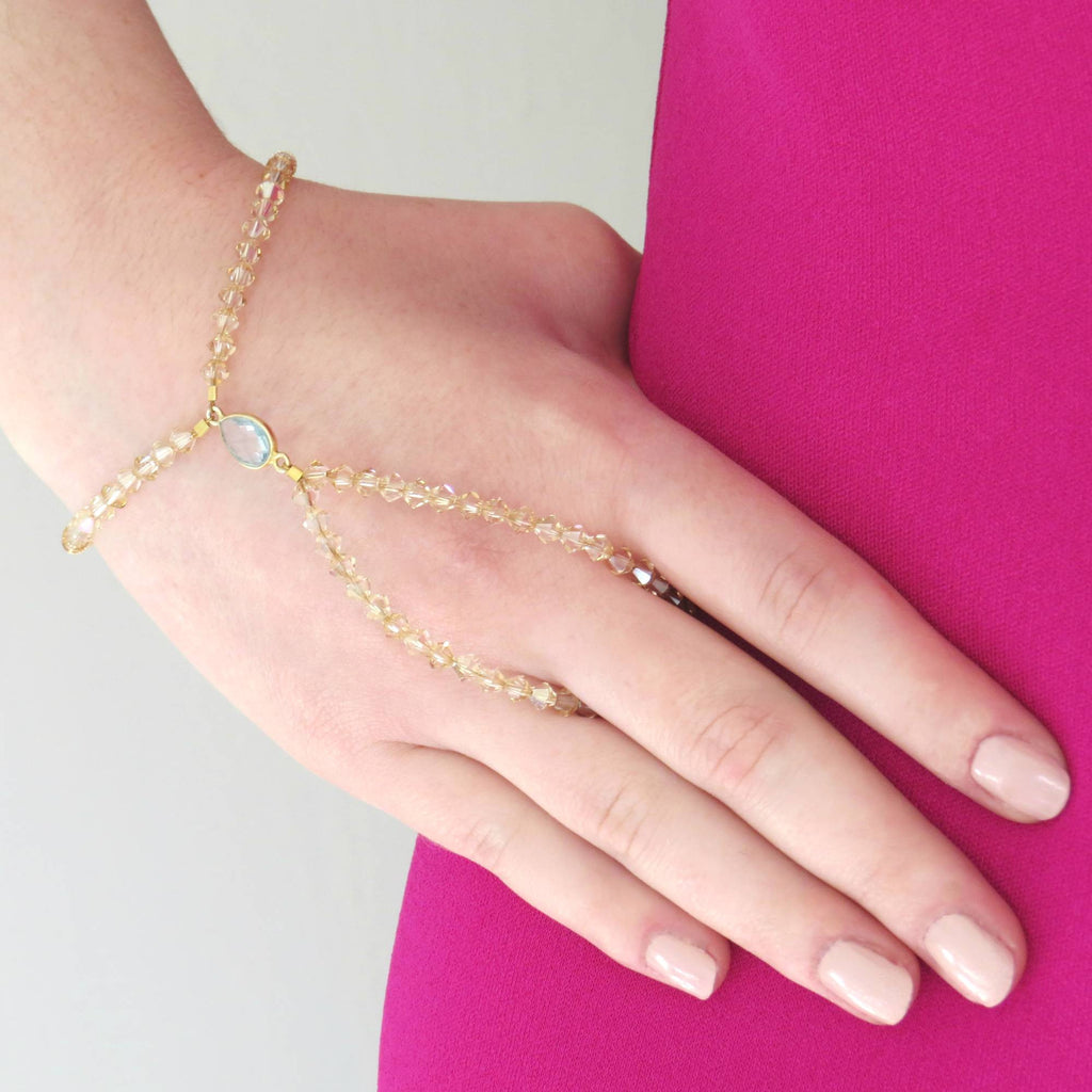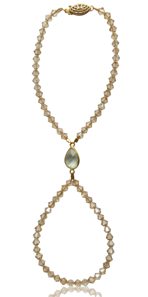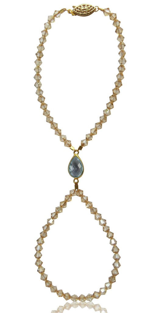 This made to order handlet has been lovingly handmade, and is created using using 4mm, gold, Swarovski crystal beads, and a feature 16mm, 18k gold vermeil, bezel set sky blue Topaz/ green Amethyst, faceted, pear pendent. These are threaded onto wire, that is fastened with a 14k gold filled 15mm filigree fish hook clasp. This piece of jewellery features an extended section to the bracelet region, that loops around your middle finger. The bracelet section measures 7" at length, and the ring section has a circumference of 150mm.